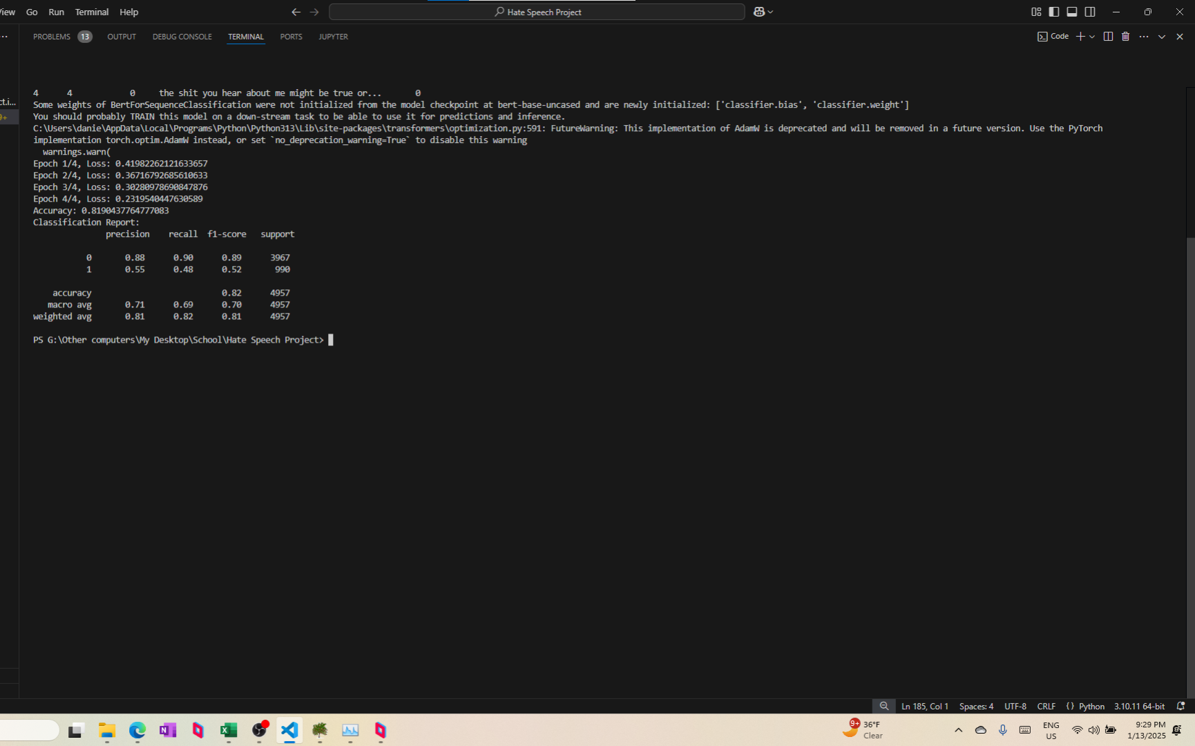 A BERT transformer model fine-tuned using PyTorch and Hugging Face Transformers for hate speech detection, achieving 82% accuracy on test data and 0.23 cross-entropy loss and evaluated performance with scikit-learn